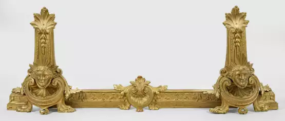 3-tlg.; Bronze. Sich konisch verjüngende Balusterelemente mit üppigem Blattwerk und Volutenmotiven sowie plastisch gestalteten Maskarons. Dazwischen flacher Steg mit erhaben reliefierten Volutenmotiven und zentraler Blattkartusche. B. 136 cm.