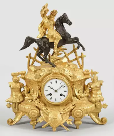 Zinkguss, goldfarben und dunkel lackiert. Über geschweift ansteigendem üppig dekorierten Gehäuse vollplastische Darstellung eine reitenden Jägers. Profilgerahmtes Zifferblatt. Pendulenwerk mit Pendelfeder sowie Halbstundenschlag auf Glocke. Pendel fehlt. H. 43 cm. 35 cm x 14 cm.