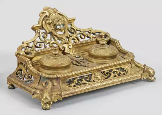 Bronze. Üppig durchbrochen gearbeiteter Korpus, flankiert von stilisierten Delphinen sowie rückseitig korrespondierende Bekrönung mit Maskaron. Behälter für Tinte und Streusand. H. 15 cm. 31 cm x 15 cm.