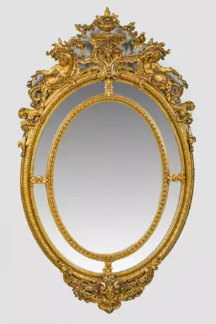 Holz, stuckiert, gefasst und vergoldet. Hochovale, umlaufend profilierte und offen gestaltete Spiegelrahmung. Durchbrochen gestaltete, leicht vorkragende Bekrönung aus reliefplastischem Widderkopf, flankiert von Genien sowie üppigen Blattranken und Volutenmotiven. Korrespondierender unterer Abschluss. Teilw. facettiertes Spiegelglas. Rest.; 122 cm x 71 cm.