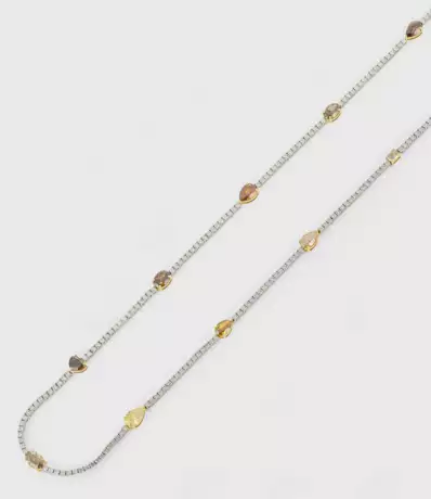 Necklace set with natural fancy yellow/brown/pink diamonds approx. 11,20 ct. and diamonds approx. 10,40 ct. (G-H/si), in 18 k white gold. Certificates included.