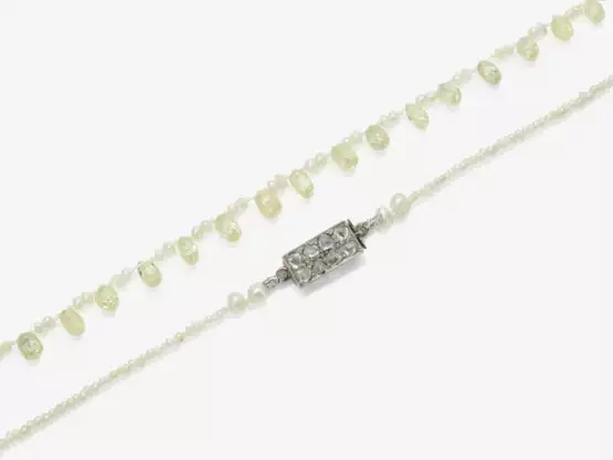 Clasp: platinum 950/-, assayed. 64 briolette-cut diamonds totalling 16 ct., fancy light yellow N/A, SI-SI2, 8 rose-cut diamonds, totalling approx. 0.16 ct., fine white, F-G, VS-SI. A large number of small river pearls (seed pearls), diameters approx. 1.23 - 2.5 mm, white to light cream, good to very good lustre. In good to very good condition. Necklace length with decorative clasp: approx. 51.5 cm. Ca. 4.52 g.