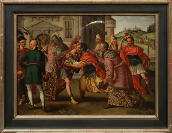 Vor den Toren Jerusalems trifft sich Absalom, um seine Verschwörung gegen König David vorzubereiten, indem er die Männer Israels vereint und zu seiner Anhängerschaft zusammenführt. In leuchtender Palette und feinem Pinselstrich gemalte, vielfigurige Komposition nach dem Werk eines laut RKD in Den Haag (RKD Nr. 216014) unbekannten, niederländischen Meisters um 1595, das sich heute im Nationalmuseum in Warschau befindet (184751 MNW) und eines von drei Kompositionen darstellt, die wohl auf Kupferstiche von Johannes Wierix nach Vorlagen von Maarten de Vos zurückgehen, die um 1585 bei Gerard de Jode erschienen sind. Öl/Eichentafel. Verso zwei rote Lacksiegel sowie ein altes Papieretikett, darauf handschriftlich in italienisch bez. mit Informationen zur Darstellung, einer Zuschreibung an Pietro Per(r)ugino sowie der Provenienzangabe als ehem. Besitz der Adelsfamilie Baglioni in Perugia. 50,3 cm x 70 cm. Rahmen.