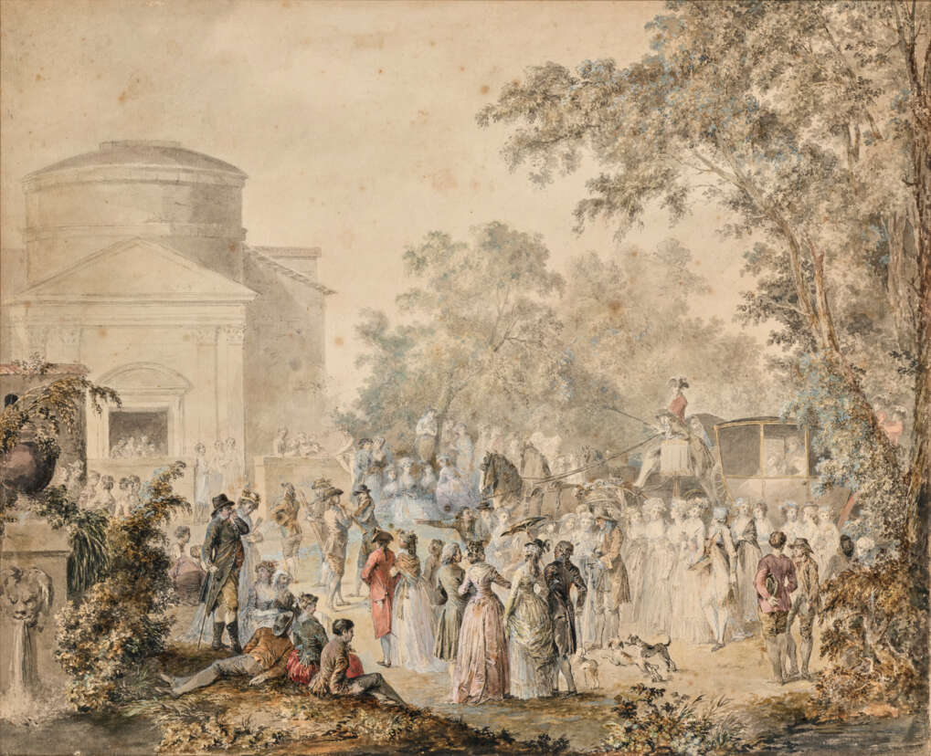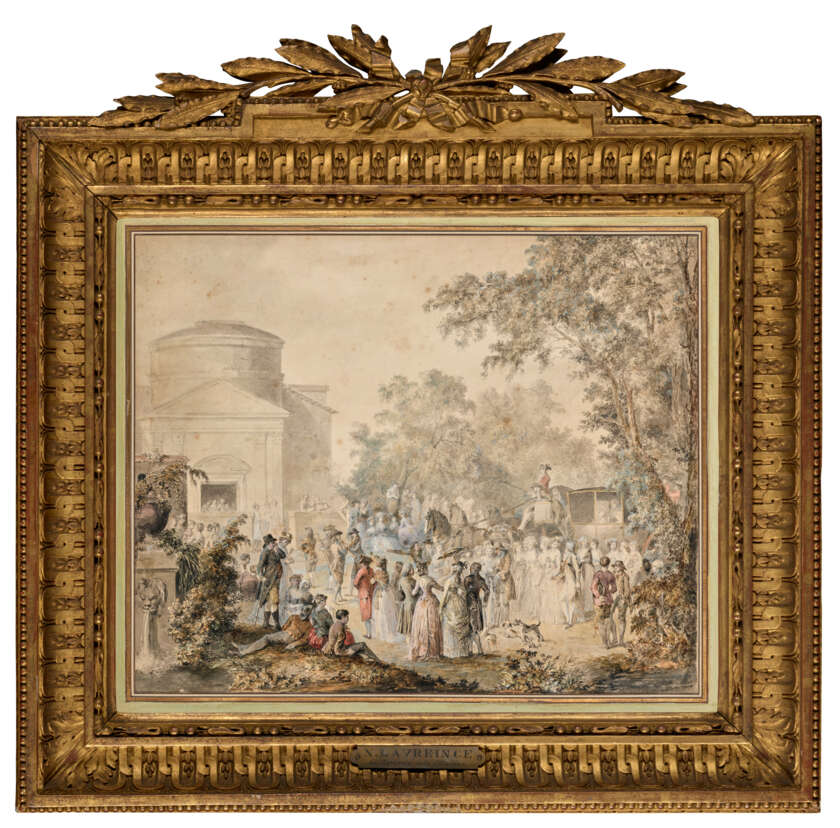Although Lavreince was familiar with tight compositions showing no more than three or four figures, and was closely associated with the gallant imagery of the rococo period, here he produced a scene of rare complexity borrowed from Watteau (1684-1721). Lavreince was probably not directly familiar with the painting The Village Bride, painted by the French master around 1710 and conserved since the 18th Century in Berlin (Charlottenburg Palace, Staatliche Garten und Schlösser Brandernburg, inv. GK I 5603; P. Rosenberg, M. Grasselli, Watteau, Paris, 1984, n° 11). However, the painting had acquired great renown: in addition to the many painted copies, Charles-Nicolas Cochin (1688-1754) had set about creating an engraving based on the painting. It was undoubtedly through this medium that Lavreince became acquained with the subject, and he chose to depict the scene in the same orientation as the engraving, as a mirror image of the painting. The Swedish artist also made a few adjustments: the pine tree, so central to Watteau's work, has here disappeared, and the costumes of the various participants are more in keeping with the taste of the late 18th century.