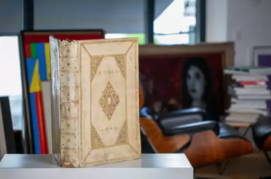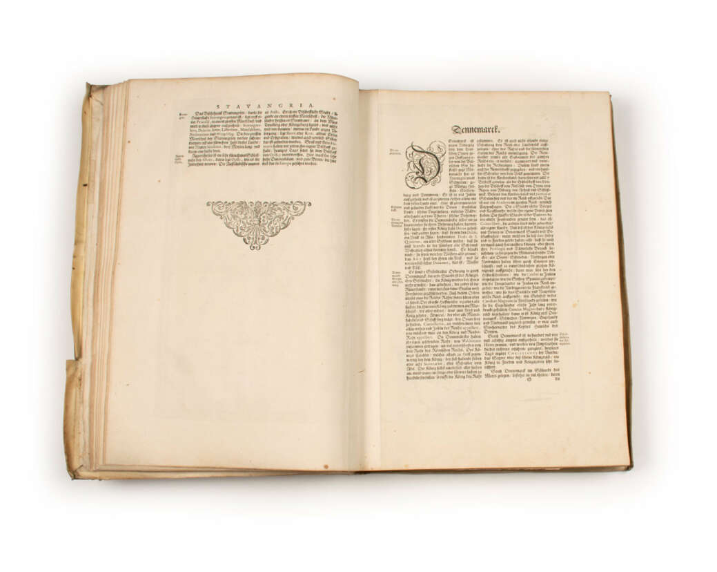 Willem Janszoon Blaeu and Johann Blaeu, Amsterdam 1647/1649, full title: ''NOVVS ATLAS, Das ist/ Weltbeschreibung/ Mit schönen neuen außführlichen Land-Tafeln in Kupffer gestochen/ und an den Tag gegeben'', containing 2 engraved title pages, main part and first part, another section (Netherlands), a total of 120 hand-coloured maps, mostly double-page, a few folding maps, according to the register complete, hand-coloured leaves and bound, parchment binding with gilt decoration and the year 1660, dimensions approx. 52 × 37.3 × 8.5 cm, signs of use and ageing, binding torn, warped and with wear such as tears, stains and creases, binding loosened, front endpaper crumpled, pages slightly stained and browned, occasional tears, primarily creases on the first page