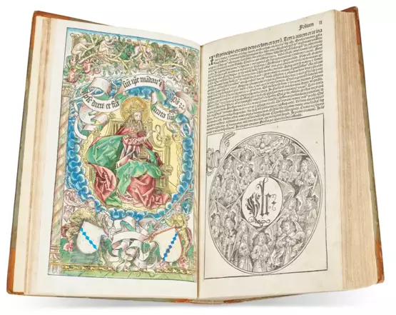 Imperial folio (414 × 275mm). 320 leaves (of 326, without V, IX, CCLXV, CCXCVII, CCXCVIII and final blank). 2 double-page maps (map of Europe and colophon laid in with chipped fore-edges). Illuminated initial on first text leaf, first full-page woodcut in contemporary color, table’s initials in red and blue, red and blue paraphs (additions including Maximilian supplement inserted after CCLXVI, tears at head and tail of gutter of first 3 leaves, tears in XXIII and CCLXVI, soiling, occasional dampstains and small wormholes). Late 18th-century Russian quarter brown calf, blue paper boards, spine tooled and lettered and in gold and blind (rebacked, rubbed, paper soiled in places). Provenance: early Latin inscriptions on title-page – John (18th-century inscription and pen trials on blank after Maximilian supplement) – William Tooke (1744–1820; inscription on title-page dated 1772) – Phyllis Goodhart Gordan (1913–1994; leather label); by descent.