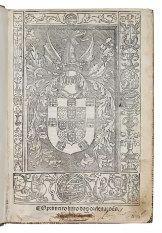 Five volumes in two, folio (296 × 200mm). Two full-page woodcuts of the Portuguese royal achievement of arms within a decorative frame incorporating four armillary spheres on first- and third-part title-pages, woodcut initials (without first blank in vols. 1, 3 and 4, vol. 1’s first quire rehinged, many leaves toned and dampstained, occasional soiling and spotting, large repaired tear in c6 of vol. 4, smaller marginal repairs). Modern green morocco-grain sheep, covers tooled in gold and in blind, spine lettered and tooled in gold, edges red, orange textured basket-weave endleaves (spine toned, few light scratched, gold lifted in places, rubbed at extremities). Provenance: contemporary annotations in Portuguese in at least two hands (trimmed) – José Mindlin, 1914–2010 (bookplate).
