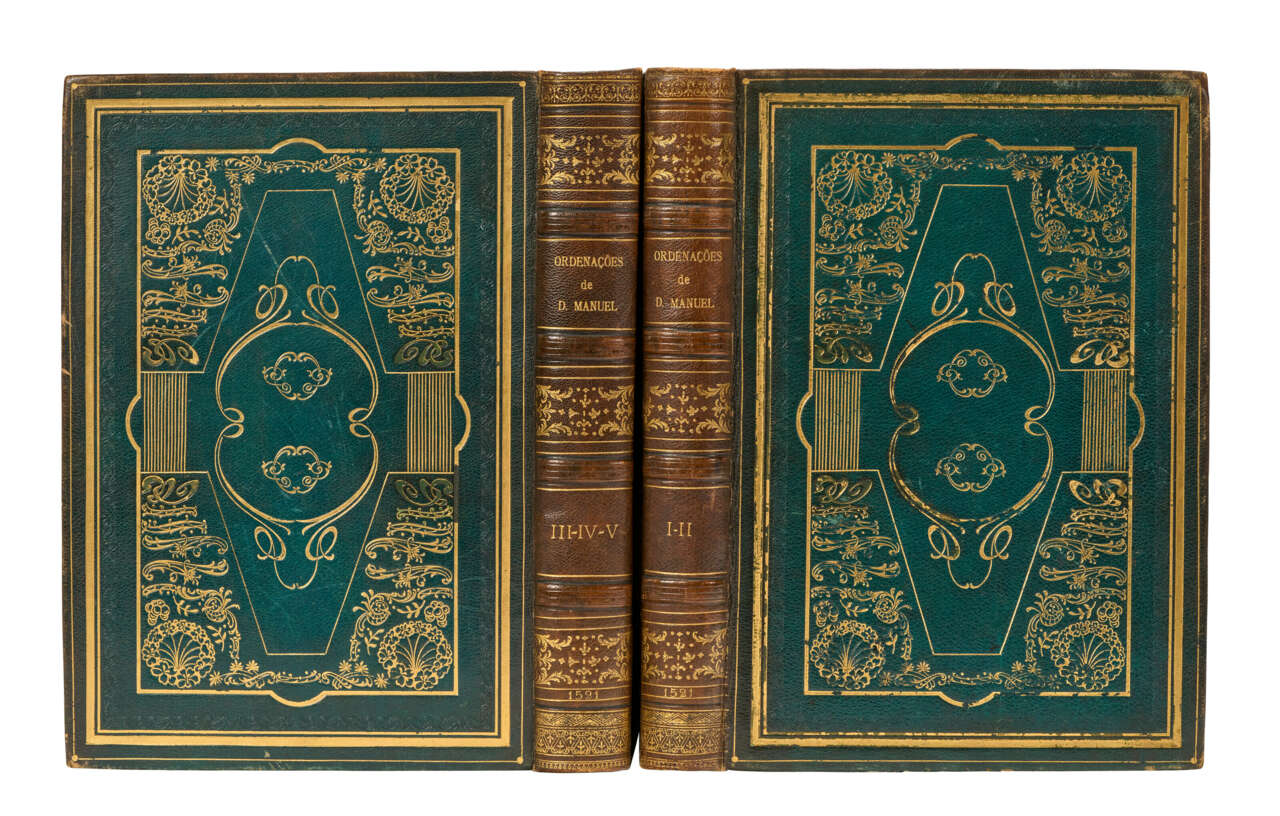 Extremely rare first edition of the third system of the Manueline Ordinances; the basis of Brazil’s legal system and influential throughout Portugal’s colonies. Modernizing Portugal’s legal system is one of the major achievements of King Manuel I’s reign. Feeling the need to adapt to meet the needs of Portugal’s expanding empire, Manuel eliminated almost all previous laws and replaced them with a new standardized legal code; this was the first time that Portugal’s ordinances were printed. The first version, or “system”, of the ordinances was published in 1512, and the ordinances were revised twice afterwards. The present five volumes constitute the first edition of the third and final system of ordinances which would remain in effect until the reforms made by Philip II & I of Spain, and which formed the core of many of Portugal’s colonies’ legal systems until they each became independence. Anselmo 534; Azevedo-Samodães 2277.