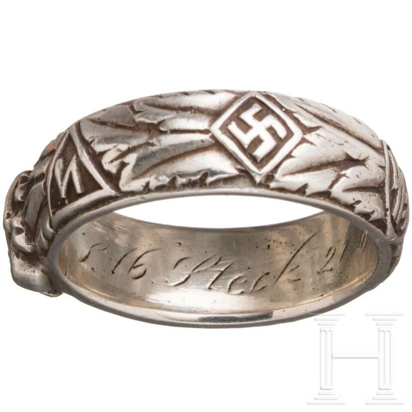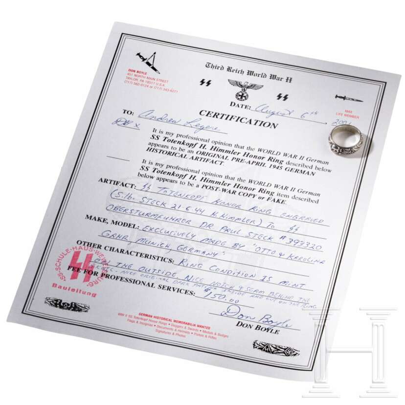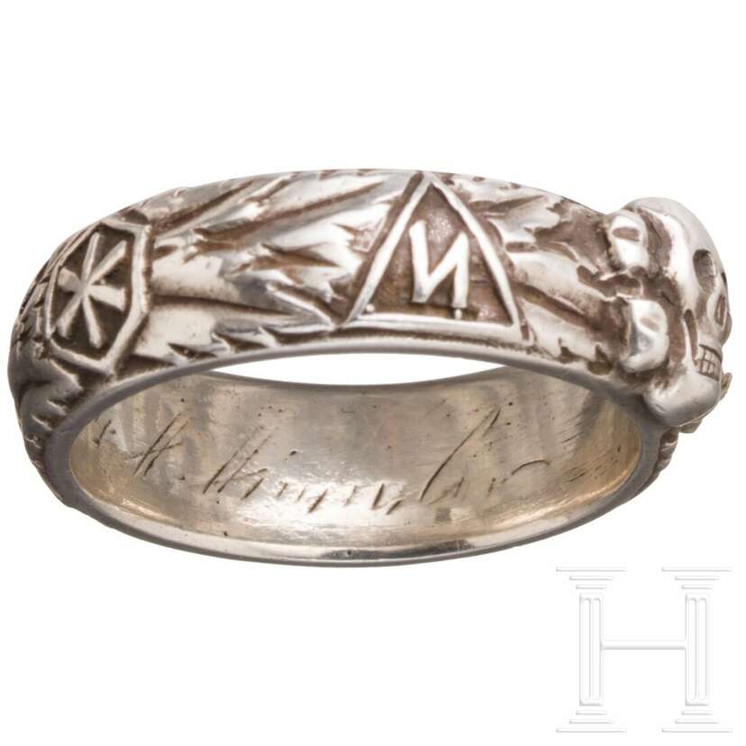 Maßanfertigung aus der Silberschmiede Otto und Karolina Gahr in München. Unter dem separat aufgesetzten Totenkopf verlötet, innen Widmungsgravur "S. lb. Steck 21.6.44 H. Himmler". Gewicht 10,1 g, Innendurchmesser 19,7 mm.
