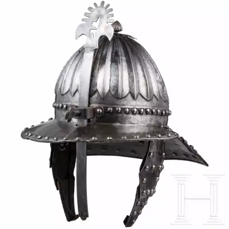 Zweiteilig geschlagene Kalotte mit 24 kräftigen Zierrippen. Jede zweite Rippe mit feinem geschnürtem Ziergrat versehen. Im Scheitel vernietete, gekehlte Spitze mit sternfömiger Zierrosette. Am unteren Rand umlaufendes Band mit dicht gesetzten Ziernieten. Nasal mit Halteschraube (ergänzt). Großer, zweiteilig gearbeiteter Augenschirm mit umlaufenden Ziernieten und gebördeltem und geschnürltem Rand (Fehlstelle). Dreifach geschobene Wangenklappen mit durchbrochen gearbeiteter Gehöröffnung und Ziernietenbesatz. Zweifach geschobener Nackenschirm mit reichem Nietenbesatz und gebördelten und geschnürten Rändern. Wangenklappen und Nackenschirm gut ergänzt. Höhe 31 cm.