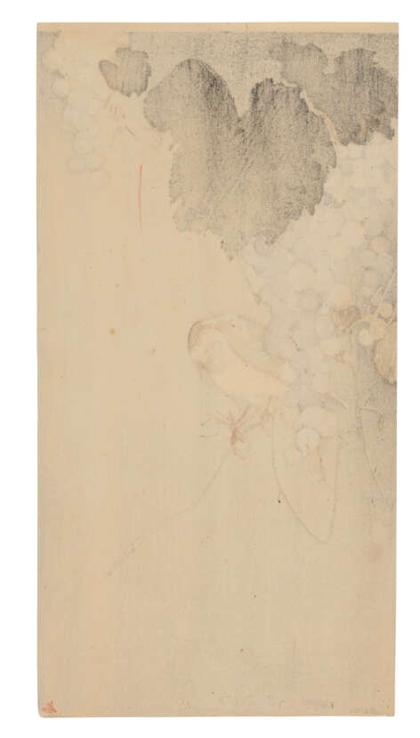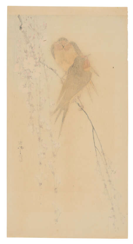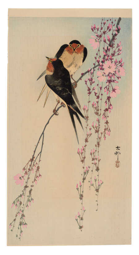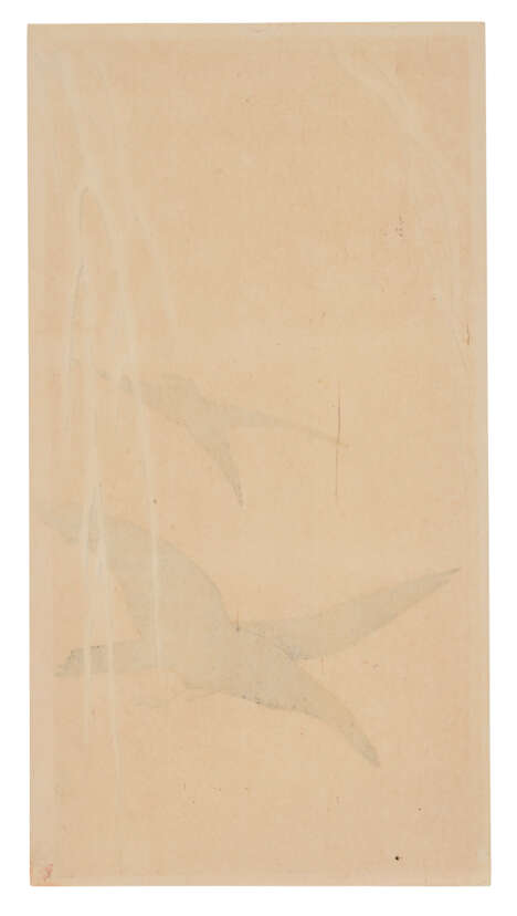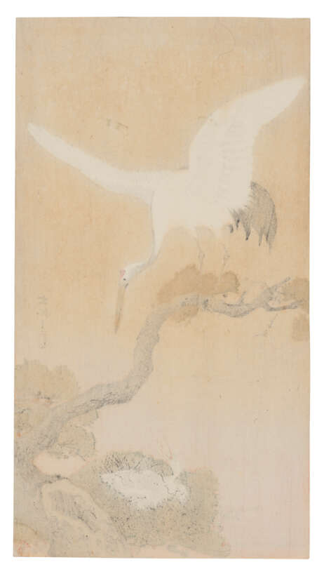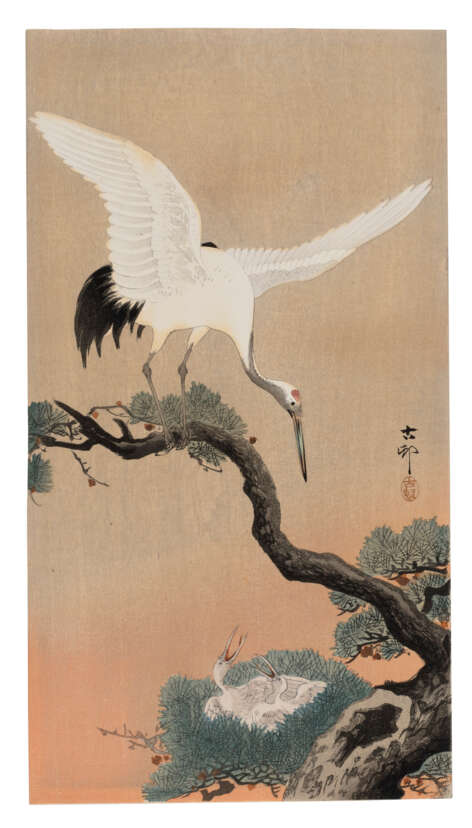 1) Pair of crows flying under snowy branches, published by Akiyama Buemon (Kokkeido)