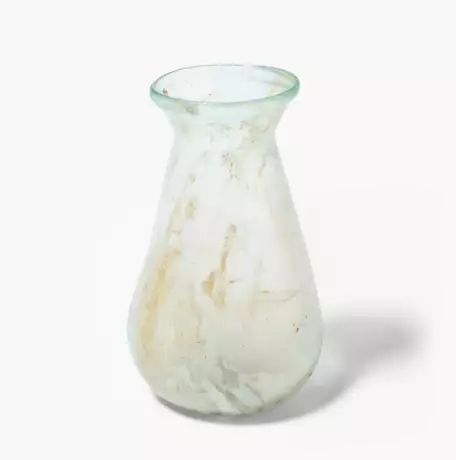 Syro-römisch, 1./2.Jh. Blassblaues Glas mit Versinterung. Birnenförmiges Gefäss mit trichterförmiger Öffnung. H 10,5 cm.