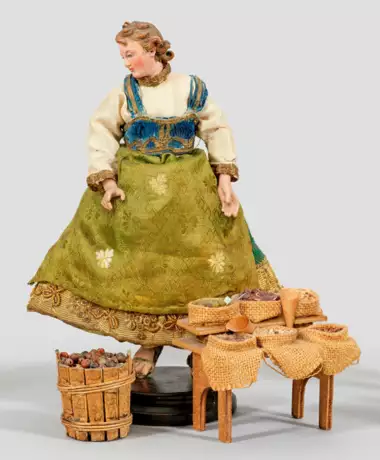 Neapolitan crib figure of a young peasant woman selling olives and nuts. Painted terracotta, glass eyes, several other materials, embroidered fabric, wood, wax. Wooden base later. Minor restored/signs of age and use.