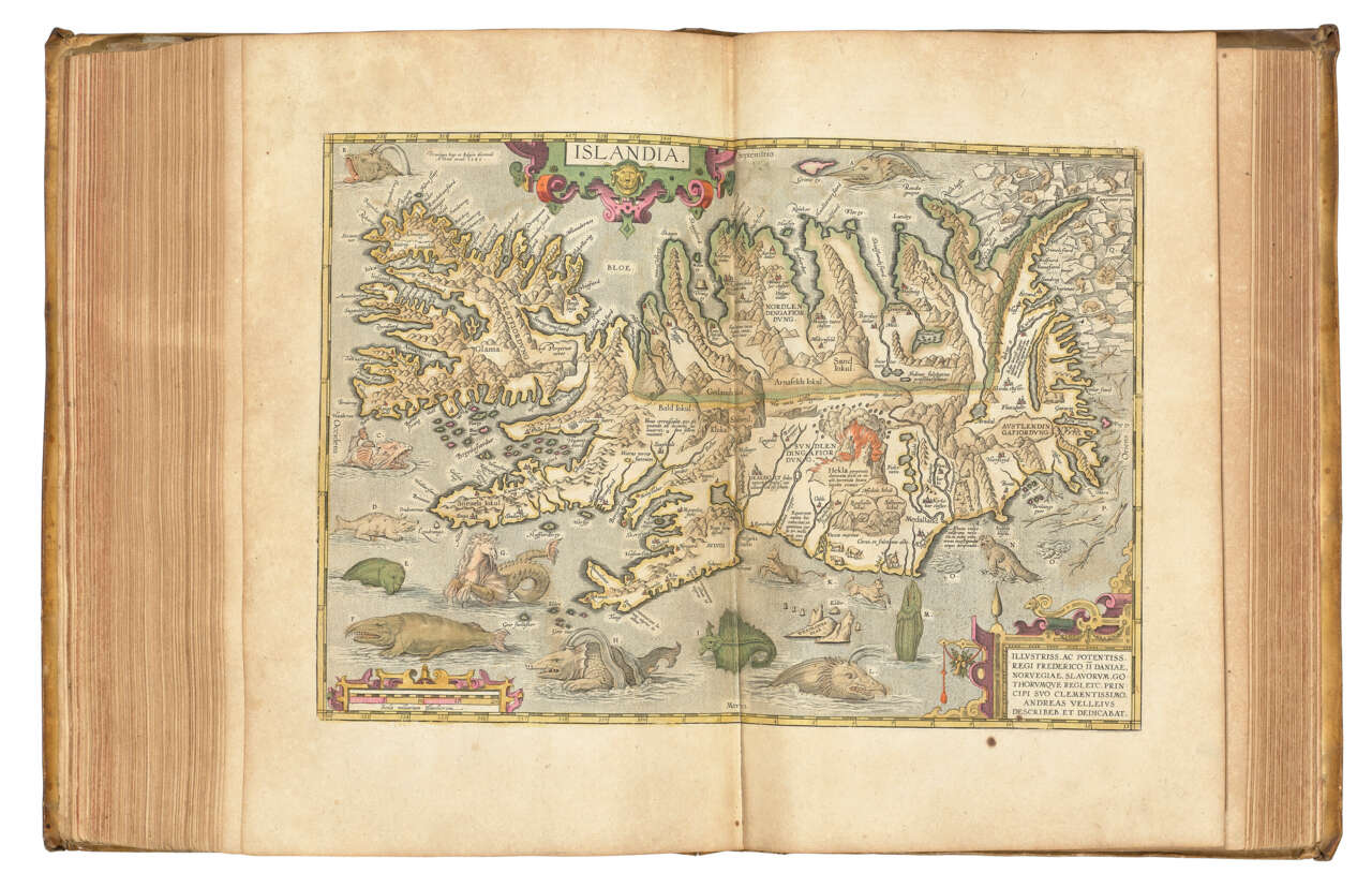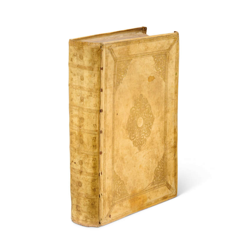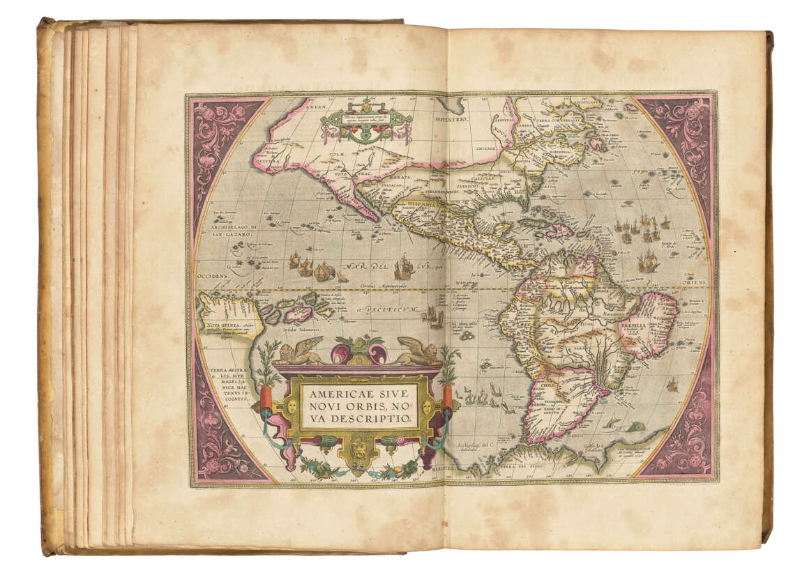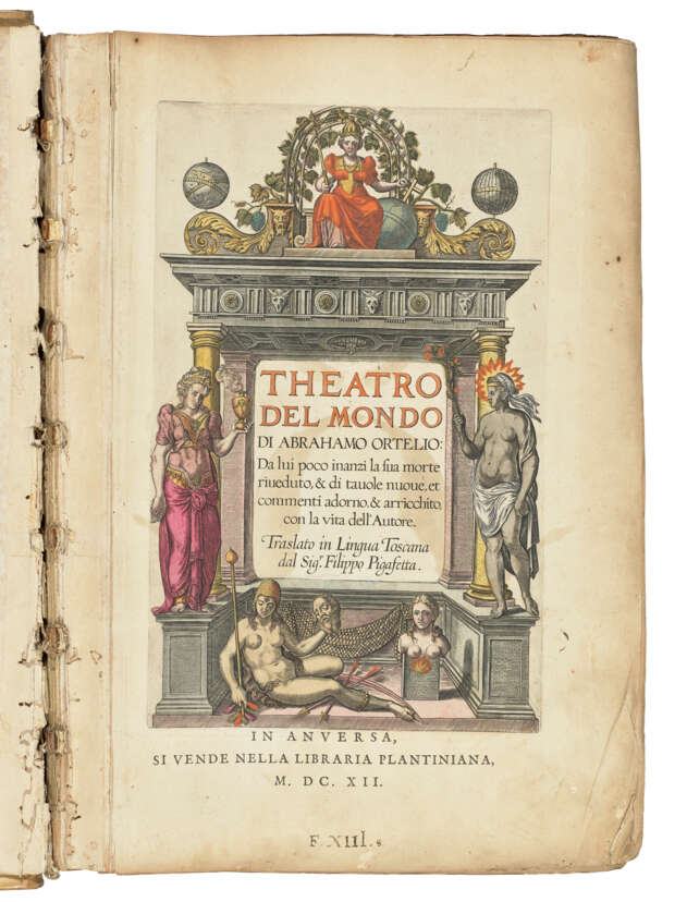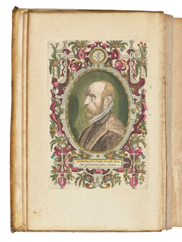 2 parts in one volume, folio (472 x 320mm). Engraved title with portrait of Pope Clement VIII to verso, full-page engraved illustration of Ortelius' epitaph incorporating small portrait on verso of A5, full-page engraved portrait of Ortelius to verso of D6, 5 engraved text-illustrations [the world system, Northern Hemisphere (‘Hemisphaerium Claudij Ptolemi’), The Old World (‘Hemisphaerium Arzahelis Frisij’), map of Europe and map of Italy], 128 double-page engraved maps, engraved title to part 2 (Parergon), 33 double-page engraved maps and 5 double-page plates, all coloured by a contemporary hand, with the Nomenclatur Ptolemaicus (Antwerp, 1607) bound at end (map 48 ‘L’Hannonia’ with large 240mm tear without loss, plate ‘Tempe Di Thessalia’ in Parergon with very large tear almost severing the plate in half, about 6 other maps with marginal tears some extending into printed area, map 78 ‘L’Italia’ with old crude tape repair at gutter, some extensive browning occasionally heavy, occasional creasing to maps, faint marginal dampstaining at foot to leaves at beginning and end). Contemporary vellum, panelled in gilt (rubbed and soiled, lacking silk ties).