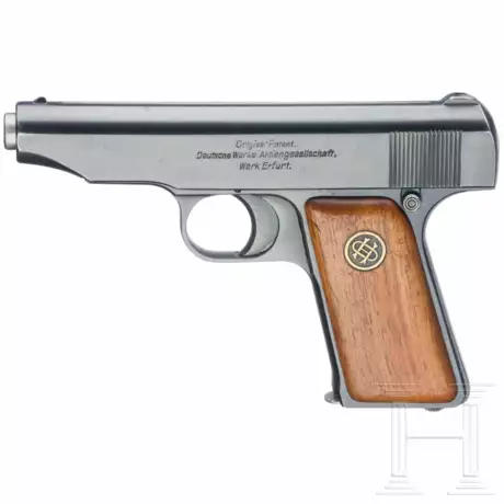 Kal. 7,65mmBrowning, Nr. 40033, nummerngleich. Blanker Lauf, Länge 87 mm. Achtschüssig. Beschuss Krone/"N". Links am Verschluss dreizeilig "Ortgies Patent / Deutsche Werke Aktiengesellschaft / Werk Erfurt". Originale Brünierung mit Tragespuren. Glatte Holzgriffschalen mit Medaillons. Magazin.