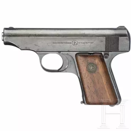 Cal. 6,35mmBrowning, SN. 168836, nummerngleich. Rauer Lauf, Länge 68 mm. Siebenschüssig. Beschuss Krone mit "N". Links einzeilige Firmierung, rechts "Ortgies Patent". Originale Brünierung, Tragespuren. Glatte Holzgriffschalen mit Medaillon. Magazin.