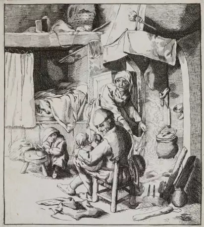 Bauer an der Tür (Ho. 9). Blgr.10,9 x 9,5 cm. Mit dem Namenszug i.d. Platte. Mit Rändchen um die Plattenkante. - Familie am Kamin. Blgr. 12,2 x 10,7 cm. Mit Rändchen um die Plattenkante. - Alter Mann mit weißem Kragen u. spitzer Mütze (Hut). 6,8 x 4,8, Blgr. 8,7 x 6,9 cm. Gegens. Kopie.