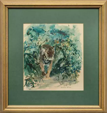 Der wie unvermittelt aus dem Busch auf den Betrachter frontal zulaufende Tiger gehört in die große Werkgruppe exotischer Tiere, die Dill nach seiner ersten Afrikareise 1924 zu einem Hauptbetätigungsfeld machte und für die er berühmt wurde. Das überwiegend in Blau-Grün-Tönen ausgeführte Bild ist in seiner skizzenhaften Leichtigkeit ungemein lebensnah und lässt die bedrohliche Unausweichlichkeit des nahenden Raubtiers auf den Betrachter einwirken. Als Schüler Heinrich von Zügels an der Münchner Kunstakademie vor dem Ersten Weltkrieg hatte Otto Dill sich von Anfang an auf die Tiermalerei spezialisiert, als dessen herausragender, in impressionistischer Weise malender Vertreter er bis heute angesehen wird. Aquarell/Papier. R. u. sign.; 51 cm x 44,5 cm (Passepartoutausschnitt). Rahmen.