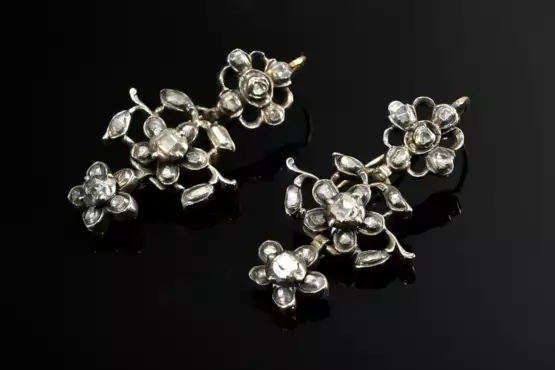 Лот 148 | Pair of antique baroque silver and 585 red gold dr…