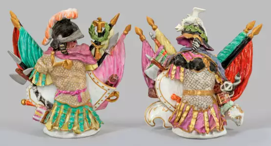 Aus dem Oval aufsteigender Harnisch mit einem Helm, bekrönt von Federn bzw. Fabeltier. Flankierend Standarten, Köcher, Fascis, Aquila sowie Schilde. Polychrome Malerei mit Goldstaffage. Eine Büste im Boden mit purpurfarbener Aufglasur bez. „K.H.C.“ (Inventarmarke der Königl. Hofkonditorei). Rest.; Minim. best.; H. 11,5 cm - 12,5 cm.