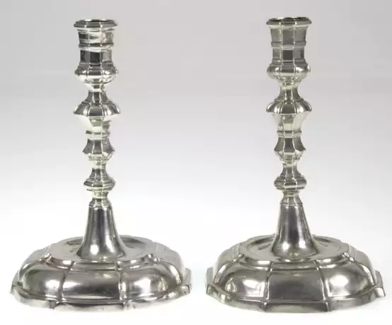 Лот 733 | Paar Barock-Leuchter, 1-kerzig, Silber (geprüft), um 1720, runder, aufgewölbter Fuß mit geschwungenen Kanten, gegliederter Schaft in kantige Tülle übergehend, Ges-Gew. ca. 610 g, H. 19 cm