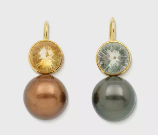 Gelbgold, 18 k. Sog. Antikhängung, unterhalb hellblauer sowie orangegelber Quarz im Briolettschliff, abschließend 2 nahezu makellose Tahitiperlen in Anthrazit und Braun von ca. 14 mm. Ges.-Gew. ca. 11,26 g.