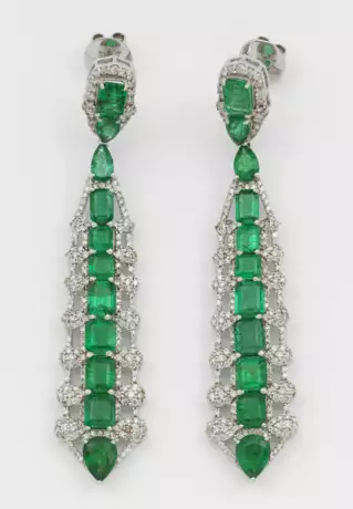 Pair of earrings set with Zambia emeralds approx. 13,77 ct. and diamonds approx. 2,40 ct., in 18 k white gold.