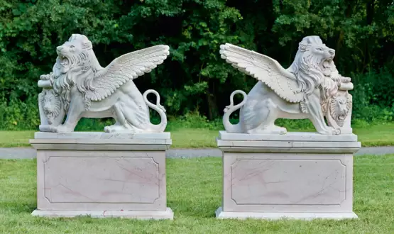 Hellgrauer, teilw. roséfarbener Marmor. Gegenstücke. Vollplastisch, im Detail partiell fein gearbeitete Mähnenlöwen, mit weit aufgerissenen Mäulern brüllend und jeweils spiegelbildlich ein Schild mit reliefiertem Löwenkopf haltend. Das repräsentative Löwenpaar steht sowohl in der Tradition der älteren Löwenskulpturen als Herrschaftssymbol an Schlössern und Parks, als auch in der Tradition der geflügelten Markuslöwen als Wappentier Venedigs. Querrechteckige Postamentsockel mit vorkragender Basis und Deckplatte, die Seiten mit rahmendem Kartuschenrelief. Skulpturen-H. ca. 77 cm; Ges.-H. ca. 137,5 cm.