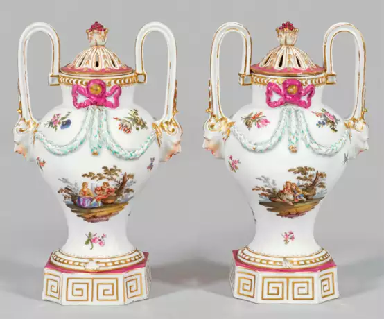 Über eingezogenem Quadratsockel mit Mäanderband amphorenförmiger Korpus mit kurzem zylindrischen Hals. Durchbrochen gearbeiteter Deckel mit Fruchtknauf. Seitlich gebogene Henkel in reliefplastischen Maskarons endend. Beidseitig der Wandung lagernde Paare in baumbestandener Landschaft. Verstreute Blumen. Oberhalb von einer Schleife bekröntes Feston. Polychrome Malerei mit Goldstaffage. Rest.; Deckel rep.; Ber.; Manufakturmarke. H. 23,5 cm.