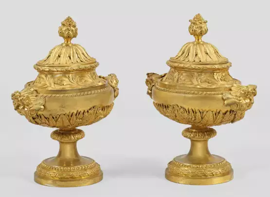 Bronze, vergoldet. Über gestuft ansteigendem Rundsockel mit breitem Fries aus gebündelten Stäben sowie schmalem Perlstab balusterförmiger, ovaler Korpus. Umlaufend flächendeckender Dekor aus reliefplastisch gestaltetem Akanthusblatt sowie üppigen, wellenartig angelegten Blattvoluten. Seitlich vollplastisch gestaltete Bacchantenköpfe. Korrespondierender, geschweift ansteigender Deckel mit Dekor aus Lanzettblättern sowie knaufförmigem oberen Abschluss, ber.; H. 30 cm.
