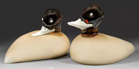 Farbloses, weißes, schwarzes und ecrufarbenes Glas, in der Form eines hintereinander schwimmenden, sich zuwendenden Entenpaares. L. 26 cm - 32 cm. H. 15 cm - 17 cm.
