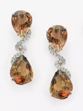 Pair of earrings set with brownish orange imperial topazes approx. 41,35 ct. and diamonds approx. 0,58 ct., in 18 k white gold.