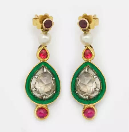 Gelbgold, 18 ct., teilw. farbig emailliert. Paisleyform, besetzt mit 2 Diamantrosen von 1,30 ct. und 1,20 ct., unterteilt durch 6 Rubincabochons. Ges.-Gew. ca. 6,57 g.