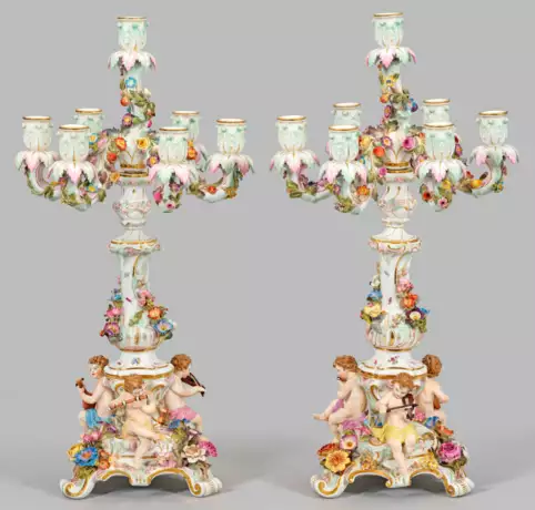 A pair of magnificent porcelain candelabra with instrument-playing cupids. Restored. Partly chipped. Crossed swords mark.