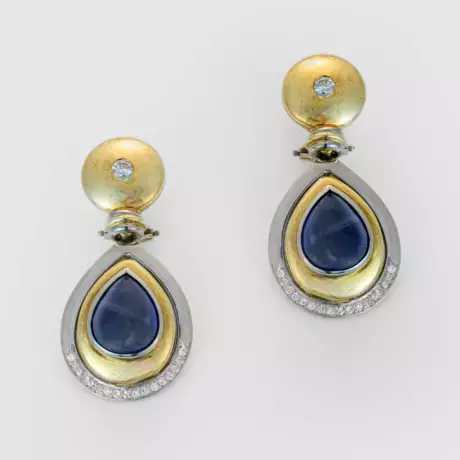 Gelb- und Weißgold, gest. 585. Zentral besetzt mit nahezu tintenblauen Saphir-Cabochons, akzentuiert von Brillanten von zus. ca. 0,50 ct.; Ges.-Gew. ca. 18,80 g.