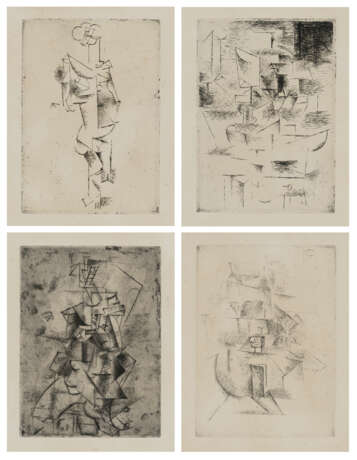 the complete artist's book comprising four etchings, on Van Gelder laid paper, 1910, signed in black ink by the artist and the author on the justification page, number 99 from the edition of 85 on Van Gelder laid paper (there was also an edition of fifteen on Japon paper), published by Daniel Henry Kahnweiler, Paris, 1911, with the title in black and red (with vignette after a woodcut by André Derain), text in French, and justification pages, each with margins, bound in a later elaborate leather binding with brown and red leather and gilt-tooled spots with gilt title on the spine, the four etchings removed from the original binding and loose