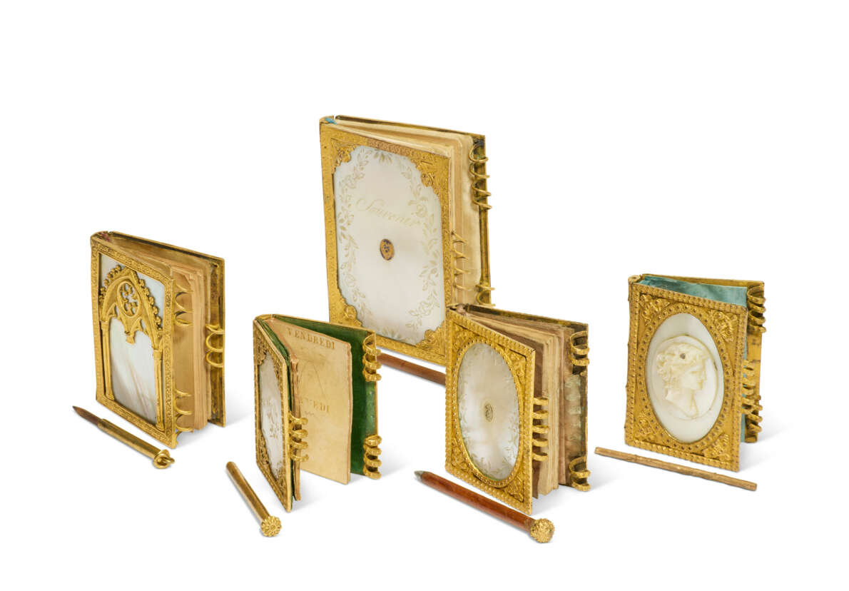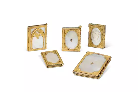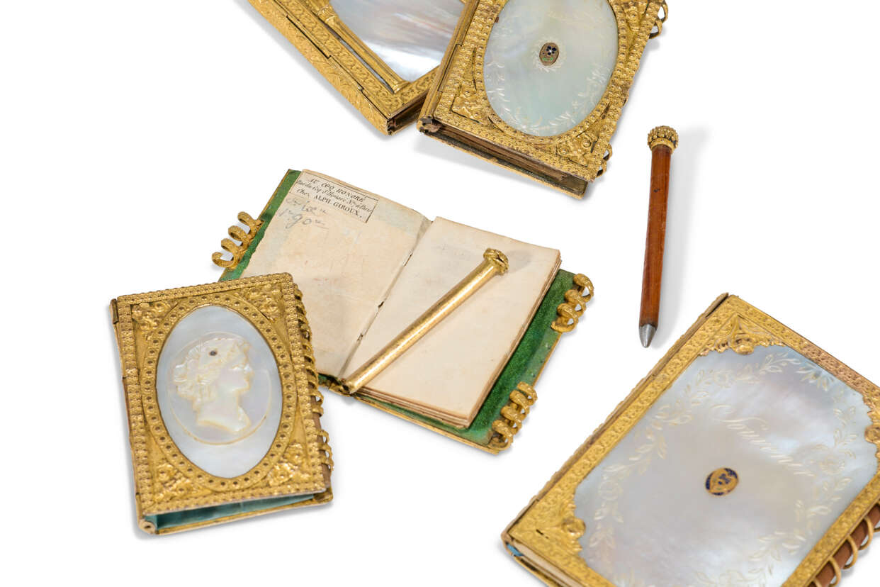 nacre et métal doré, l'un à deux camées antiquisants, l'un orné d'arcatures néogothiques, les trois autres inscrits 'Souvenir' dans la couverture en nacre dont deux avec des petites fleurs émaillées (l'un portant l'inscription manuscrite 'Si ton amour est / entré dans son / âme sans la / briser il n'en sortira / pas !') et l'un provenant de la maison de tabletterie Alphonse Giroux - Au Coq Honoré