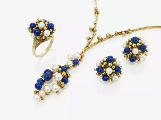 Лот 67 | A parure with necklace, stud earrings, and ring with lapis lazuli and cultured pearls