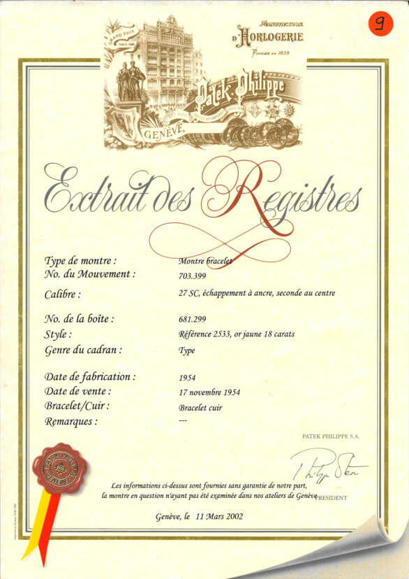 WITH: Extract from the Archives confirming production of the present watch in 1954 and its subsequent sale on 17 November 1954