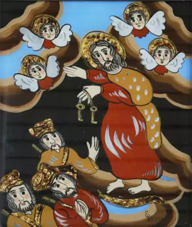 (geb. 1923 Zakopane). Jesus überreicht Petrus dies Himmelsschlüssel. Hinterglasmalerei, 1972. 39,5 x 31 cm. Unt. re. sign. u. dat. Ger.