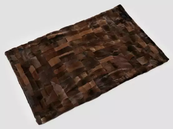 Rechteckige Decke aus dunkelbraunem, in unterschiedlich großen Rechtecken asymmetrisch angeordnetem, gerupftem, sog. Samt-Nerz. Rückseite aus dunkelbraunem Wollstoff. 198 cm x 154 cm.