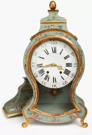 Westschweiz, um 1780. Auf der Werkplatine signiert "Voumard Huguenin & Compagnie à Courtelaris en Erguelle"(Vallon de St. Imier). Geschweiftes Holzgehäuse mit Sockel und Aufsatz. Meergrün gefasst, polychrome Blumenmalerei und vergoldete Kanten. Emailzifferblatt mit römischen Stunden- und arabischen Minutenzahlen. Ornamental fein ausgesägte und vergoldete Zeiger. Signiertes Messingwerk mit Spindelhemmung. Fadenpendel. Viertelstundenschlag auf zwei Glocken, Zugrepetition. Gangfähig. Höhe 98 cm.