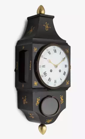 Neuenburg, um 1840. Schwarz gefasstes Holzgehäuse mit vergoldeten Fleurons. Emailzifferblatt mit römischen Stunden- und arabischen Minutenzahlen. Fein ausgesägte und vergoldete Zeiger. Pendelguichet. Messingwerk mit Ankerhemmung. Fadenpendel. Viertelstundenschlag auf zwei Glocken. Gangfähig. Höhe 54,5 cm.