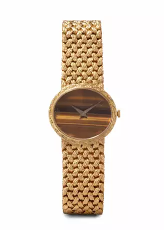 Ref. 9801 D2. Ovales, strukturiertes 750 Gelbgold-Gehäuse, Nr. 190385, 27x24 mm. Tigerauge-Zifferblatt mit goldenen Dauphine-Zeigern, signiert. Handaufzug Kal. 9P, Werk Nr. 7001291. Strukturiertes Ährenmusterband mit Leiterverschluss. Innenumfang ca. 15,5 cm. Gesamtgewicht 64 g. Funktionstüchtig.