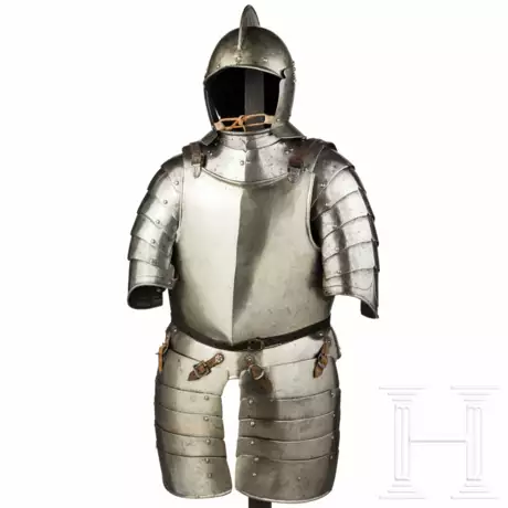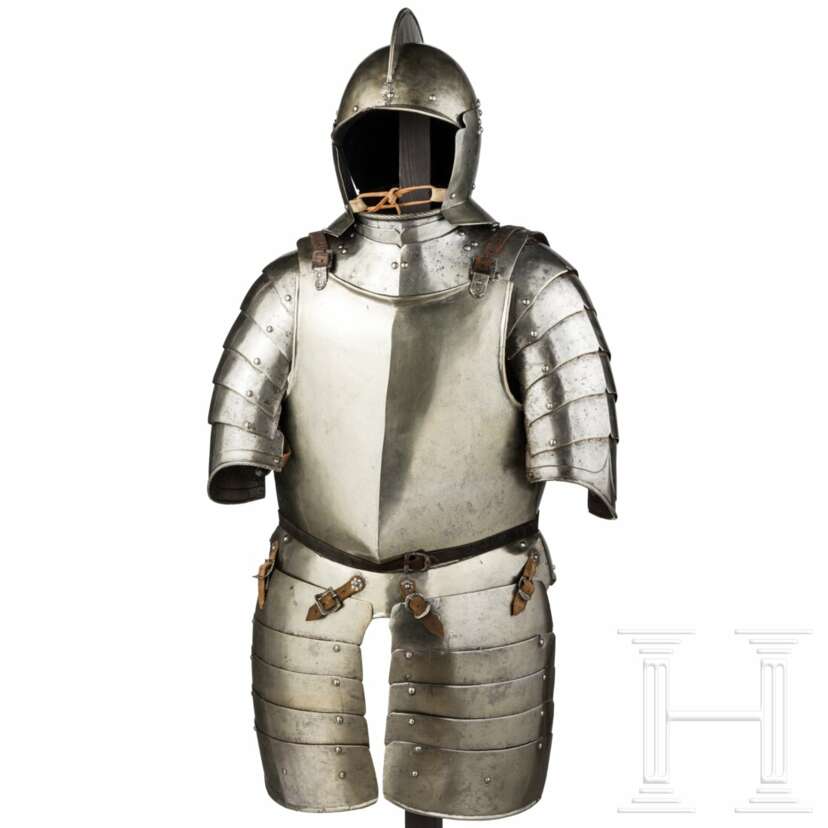 Sturmhaube mit zweiteilig geschlagener Kalotte und hohem, gebördeltem Kamm. Spitz zulaufender Augenschirm, scharniergelagerte Wangenklappen mit je sieben Gehörlochungen. Vernieteter Nackenschirm mit gebördeltem Rand. Im Scharnier zu öffnender Kragen mit gegrateter Vorderplatte und zwei Halsgeschüben, das obere mit kräftigem, geschnürtem Brechrand. Reparaturstelle am rechten Rand. Anhängende fünffach geschobene Schultern mit gebördeltem und geschnürtem Abschluss. Gegratete Brustplatte mit kräftigen, nach innen umgeschlagenen Brechrändern. Unterhalb des Kragens geschlagene Marke "V". Vernieteter Bauchreif mit anhängenden, vierfach geschobenen Tassetten. Rückenplatte mit gebördelten und geschnürten Rändern, der vernietete Gesäßreif mit umlaufend messingplattierten Futternieten. Aus alten Teilen zusammengestellt, Belederung großteils erneuert. Höhe ca. 105 cm.
