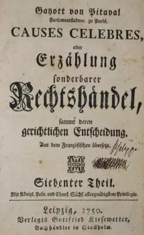 ╔Enthält:╗ Schiller,F.v. Merkwürdige Rechtsfälle als ein Beitrag zur Geschichte der Menschheit. Tl. 1 (von 4). Jena 1792. - Klein,E.F. u.a. (Hrsg.). Archiv des Criminalrechts. Bd. 4, Heft 2. Halle 1801. - Buchholz,E.F. Historische Denkwürdigkeiten aus Kriminalprozessen der neuern Zeit. Bd. 2. Budapest 1816. - Pitaval,G.v. Erzählung sonderbarer Rechtshändel... Tle. 1-2 u. 7 in 3 Bdn. Lpz. 1747 u. 1750. - Versch. starke Gebrauchsspuren.