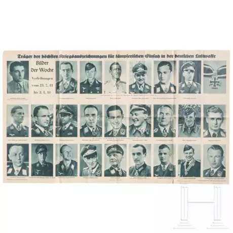 Das Plakat zeigt mehrere Soldaten der Luftwaffe, welche mit dem Eichenlaub und Eichenlaub mit Schwertern zum Ritterkreuz ausgezeichnet wurden, aus der Reihe "Bilder der Woche", Maße 102x60 cm. Alters- und Gebrauchsspuren, gefaltet.