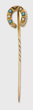 Gelb- und Roségold, 14 k. Hufeisenförmiger Kopf, besetzt mit kleinen Saatperlen und blauen Cabochons. Gew. ca. 1,38 g.