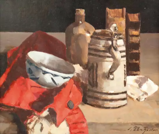 (1898 München - Holzkirchen 1976). Stillleben mit Bierkrug, Schale und Büchern. Öl auf Hartfaserplatte. Sign. und dat. (19)70. 33 x 39 cm. - Gerahmt. - An den Rändern minimal berieben.