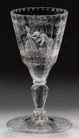 A Silesian cut and engraved glass goblet with marriage scene and inscription.